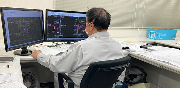 施主やゼネコン(建設会社)、設計事務所などから依頼を受けCADを使い、平均40~50枚の図面を書きます。プロット図から配線図など、電気工事に必要な図面が、まず完成されます。