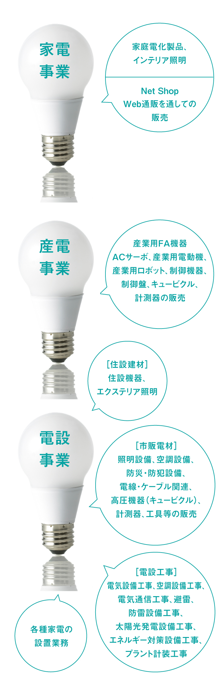 私たちは、伊藤電機だからこそできるさまざまな事業を通して、電気で快適な暮らしを支え、街に活気を生みだしていきます。
