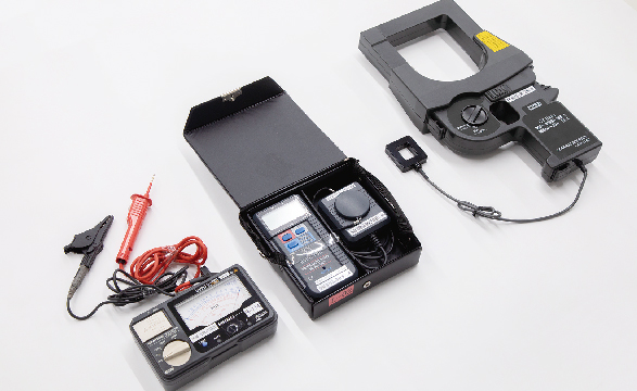 おもに電気工事で使用されるところの電圧・電流を確認する「テスタ」「クランブメーター」、漏電を未然に防ぐ「絶縁抵抗計」、アースを規定通り運用する「接地抵抗」等の計測器を扱っています。
